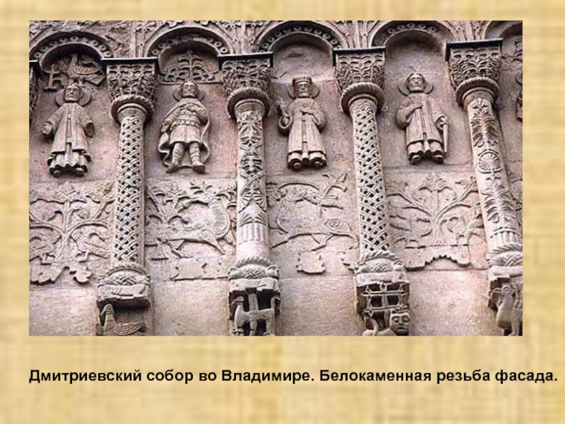 Слайд 11Дмитриевский собор во Владимире. Белокаменная резьба фасада.