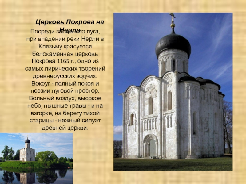 Церковь Покрова на НерлиПосреди заливного луга, при впадении реки Нерли в Клязьму красуется белокаменная церковь Покрова 1165