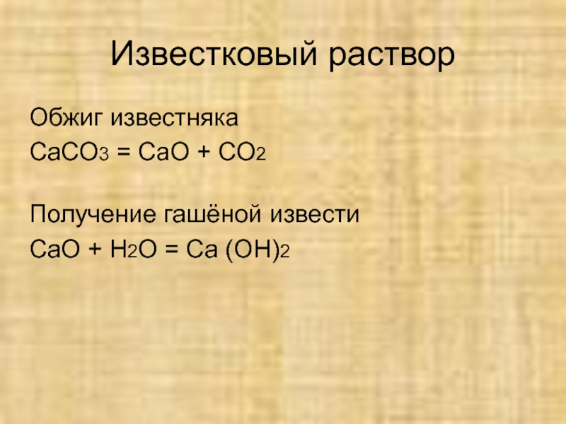 Известковый растворОбжиг известнякаCaCO3 = CaO + CO2Получение гашёной известиCaO + H2O = Ca (OH)2