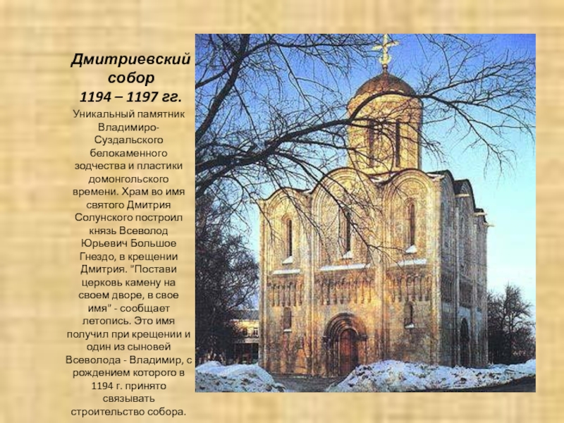 домонгольского времени. Храм во имя святого Дмитрия Солунского построил князь Всеволод Юрьевич Большое Гнездо, в крещении Дмитрия. "Постави церковь камену на своем дворе, в свое имя" - сообщает летопись. Это имя получил при крещении и один из сыновей Всеволода - Владимир, с рождением которого в 1194 г. принято связывать строительство собора.