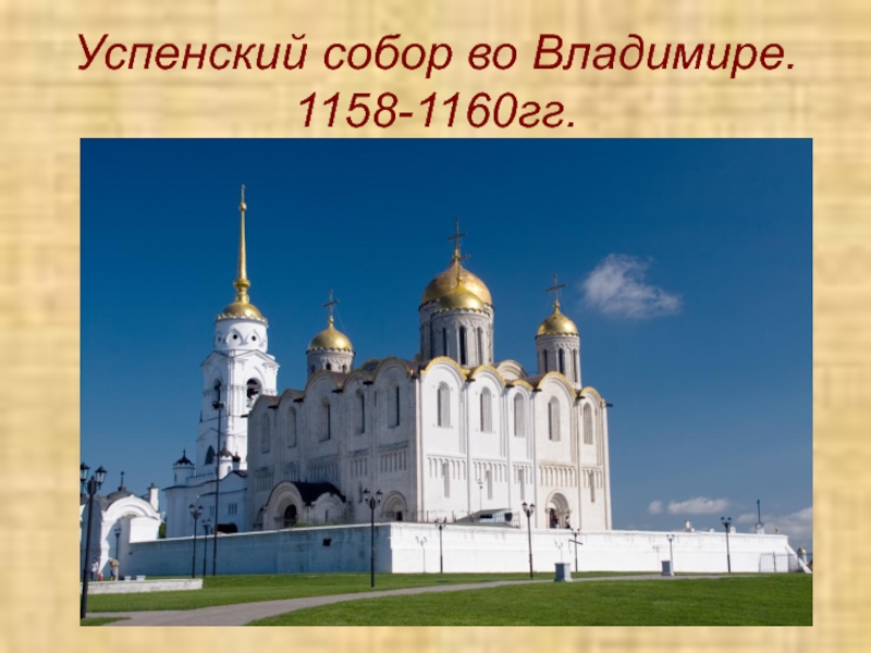 построек. Первоначально собор был построен в 1158–1161 годах при князе Андрее Боголюбском на высоком берегу Клязьмы в центре города и мыслился не только как главный храм Владимиро-Суздальского княжества, его культурный, политический и религиозный центр, но и как главный храм всей Руси.