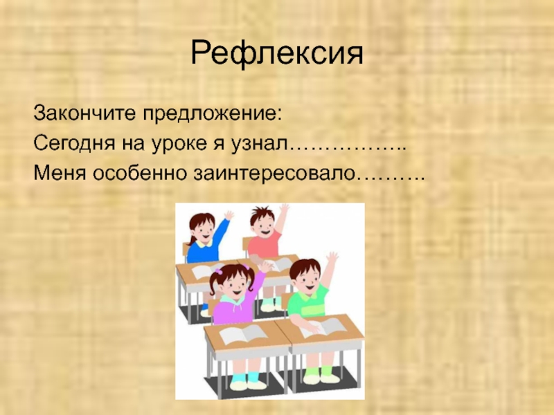 РефлексияЗакончите предложение: Сегодня на уроке я узнал……………..Меня особенно заинтересовало……….