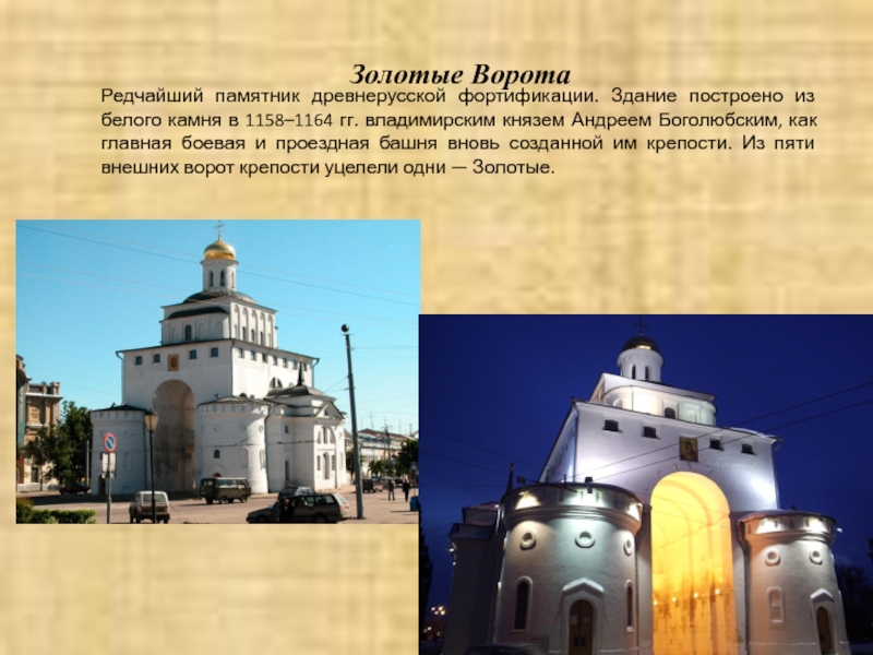 Золотые ВоротаРедчайший памятник древнерусской фортификации. Здание построено из белого камня в 1158–1164 гг. владимирским князем Андреем Боголюбским,