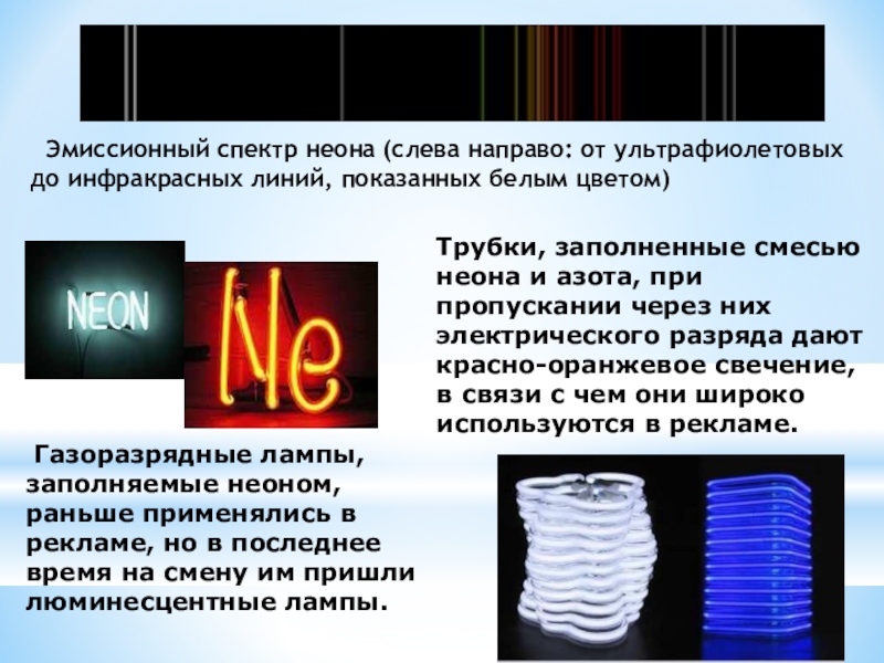 Газоразрядные лампы, заполняемые неоном, раньше применялись в рекламе, но в последнее время на смену им пришли люминесцентные лампы.