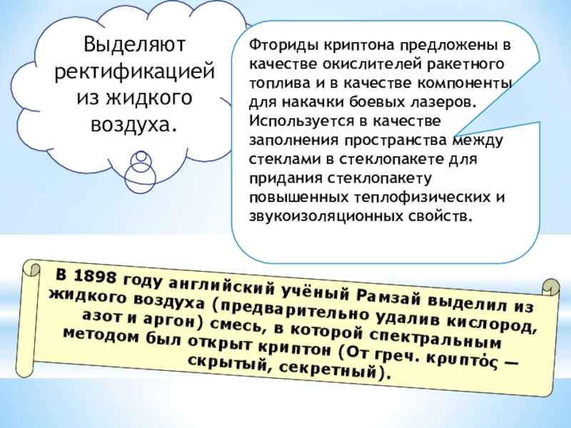 В 1898 году английский учёный Рамзай выделил из жидкого воздуха (предварительно удалив кислород, азот и аргон) смесь, в которой спектральным методом был открыт криптон (От греч. κρυπτός — скрытый, секретный).