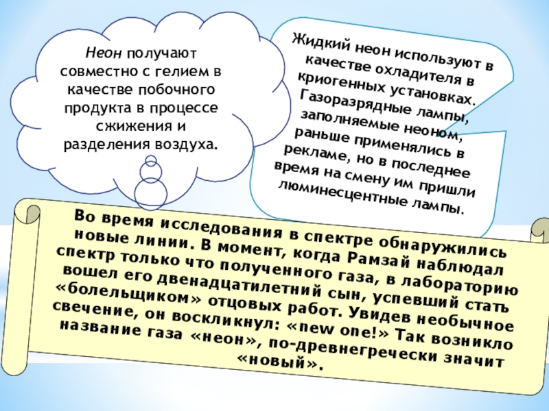 Во время исследования в спектре обнаружились новые линии. В момент, когда Рамзай наблюдал спектр только что полученного газа, в лабораторию вошел его двенадцатилетний сын, успевший стать «болельщиком» отцовых работ. Увидев необычное свечение, он воскликнул: «new one!» Так возникло название газа «неон», по-древнегречески значит «новый».