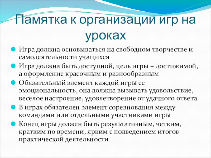 Игра должна быть доступной, цель игры – достижимой, а оформление красочным и разнообразным