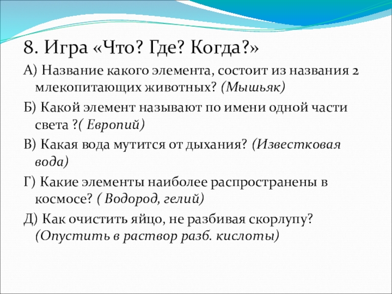 Д) Как очистить яйцо, не разбивая скорлупу? (Опустить в раствор разб. кислоты)