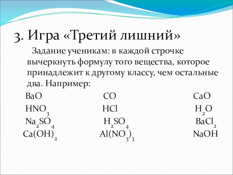 строчке вычеркнуть формулу того вещества, которое принадлежит к другому классу, чем остальные два. Например: