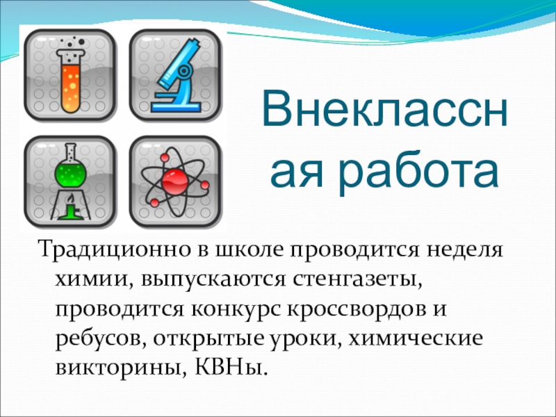конкурс кроссвордов и ребусов, открытые уроки, химические викторины, КВНы.