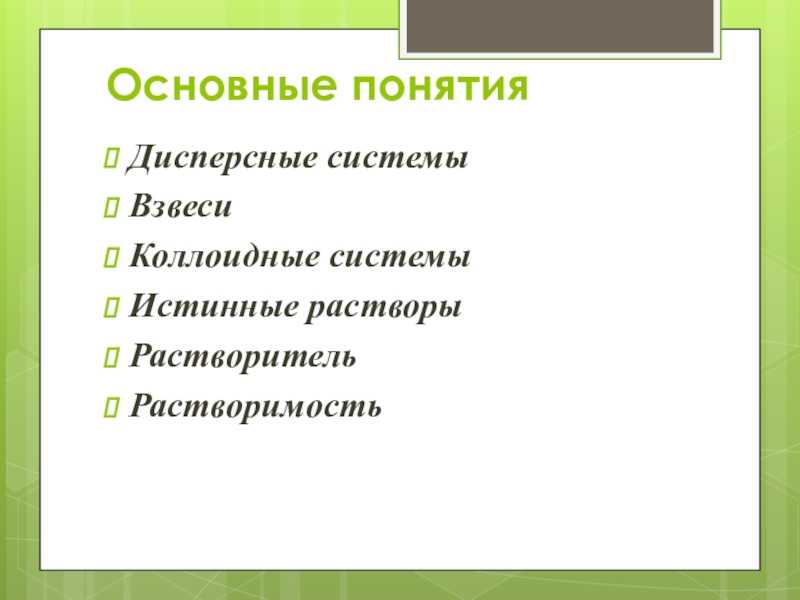 Основные понятияДисперсные системыВзвесиКоллоидные системы Истинные растворыРастворительРастворимость