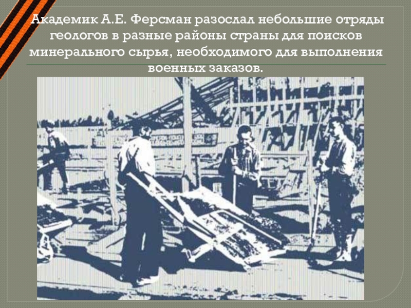 Слайд 8 Академик А.Е. Ферсман разослал небольшие отряды геологов в разные районы