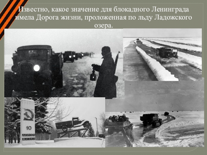 Слайд 10Известно, какое значение для блокадного Ленинграда имела Дорога жизни, проложенная по