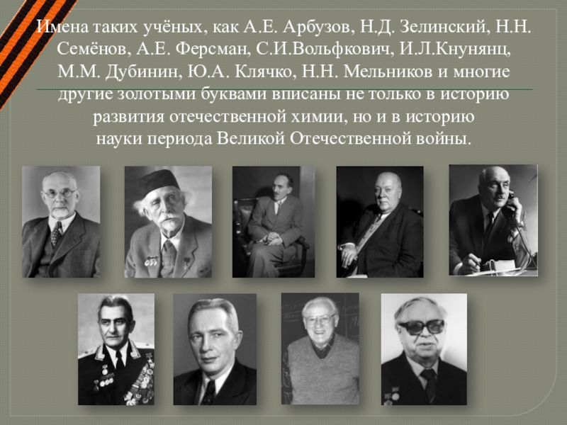 Слайд 4Имена таких учёных, как А.Е. Арбузов, Н.Д. Зелинский, Н.Н. Семёнов, А.Е.