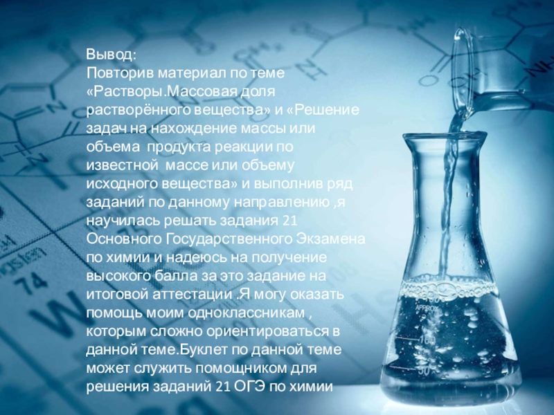 на нахождение массы или объема продукта реакции по известной массе или объему исходного вещества» и выполнив ряд заданий по данному направлению ,я научилась решать задания 21 Основного Государственного Экзамена по химии и надеюсь на получение высокого балла за это задание на итоговой аттестации .Я могу оказать помощь моим одноклассникам ,которым сложно ориентироваться в данной теме.Буклет по данной теме может служить помощником для решения заданий 21 ОГЭ по химии