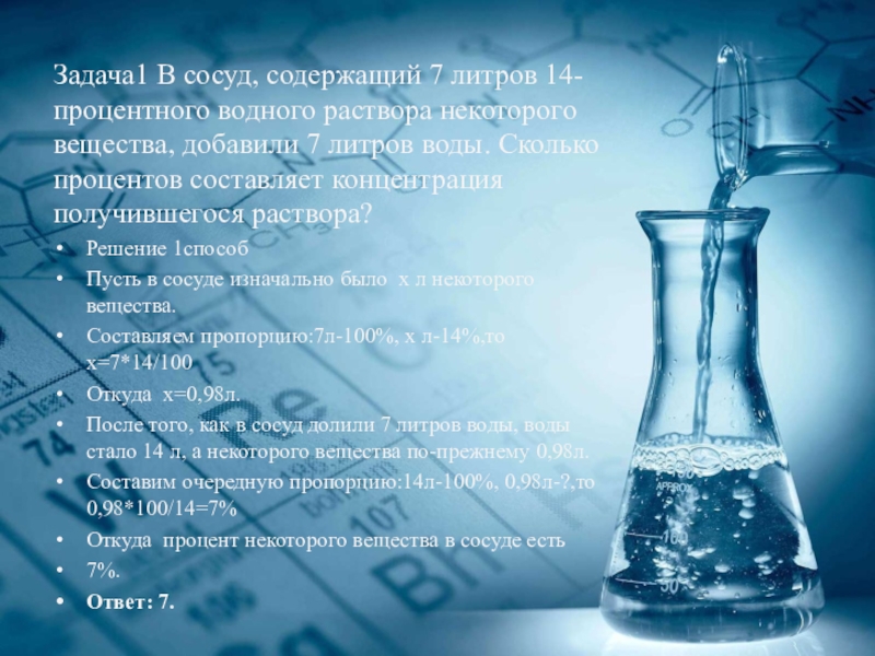 Слайд 8Задача1 В сосуд, содержащий 7 литров 14-процентного водного раствора некоторого вещества, добавили