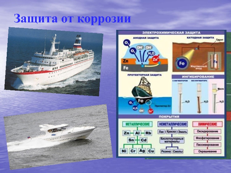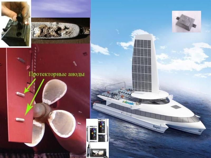 Места подводной части судна, особенно сильно подверженные коррозии, защищают с помощью анодов – небольших металлических блоков, металл которых по отношению к корпусу является неблагородным. Стальной корпус защищают анодами там, где возникают гальванические элементы, например, в районе гребного винта.
