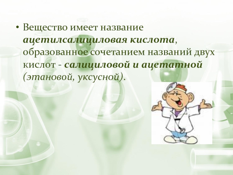 Слайд 30Вещество имеет название ацетилсалициловая кислота, образованное сочетанием названий двух кислот -