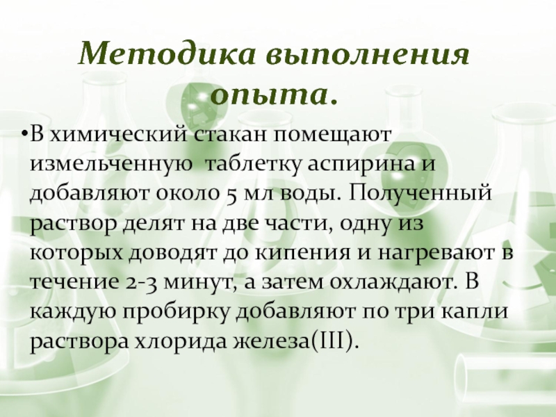 добавляют около 5 мл воды. Полученный раствор делят на две части, одну из которых доводят до кипения и нагревают в течение 2-3 минут, а затем охлаждают. В каждую пробирку добавляют по три капли раствора хлорида железа(III).