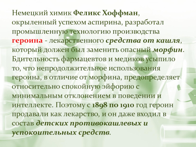 героина - лекарственного средства от кашля, который должен был заменить опасный морфин. Бдительность фармацевтов и медиков усыпило то, что непродолжительное использования героина, в отличие от морфина, предопределяет относительно спокойную эйфорию с минимальным отклонением в поведении и интеллекте. Поэтому с 1898 по 1910 год героин продавали как лекарство, и он даже входил в состав детских противокашлевых и успокоительных средств.