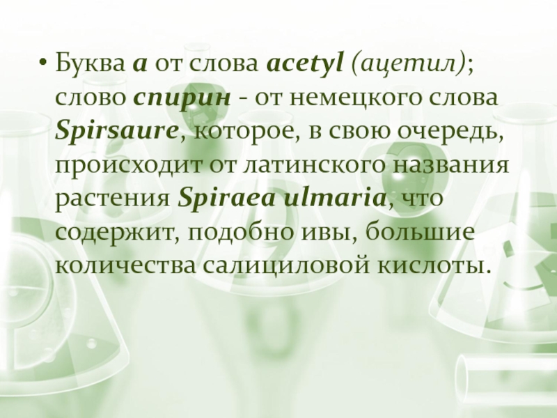 Слайд 28Буква а от слова асеtyl (ацетил); слово спирин - от немецкого