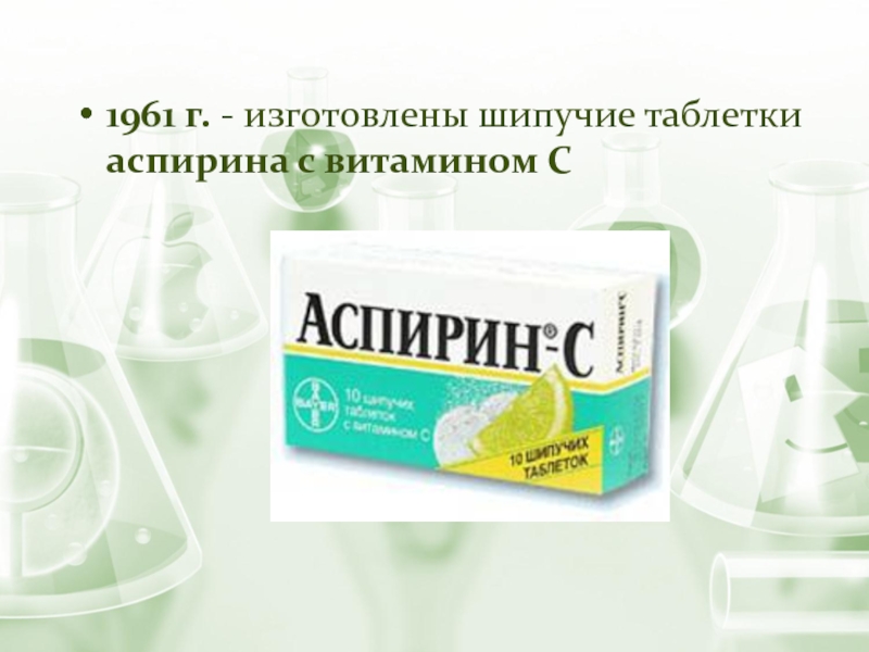 Слайд 431961 г. - изготовлены шипучие таблетки аспирина с витамином С
