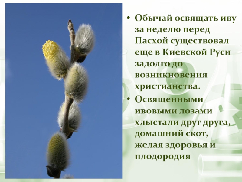 Слайд 12Обычай освящать иву за неделю перед Пасхой существовал еще в Киевской