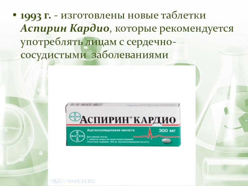 Слайд 461993 г. - изготовлены новые таблетки Аспирин Кардио, которые рекомендуется употреблять