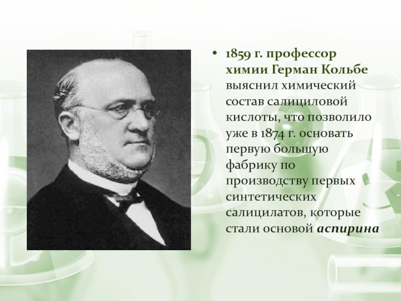 Слайд 221859 г. профессор химии Герман Кольбе выяснил химический состав салициловой кислоты,