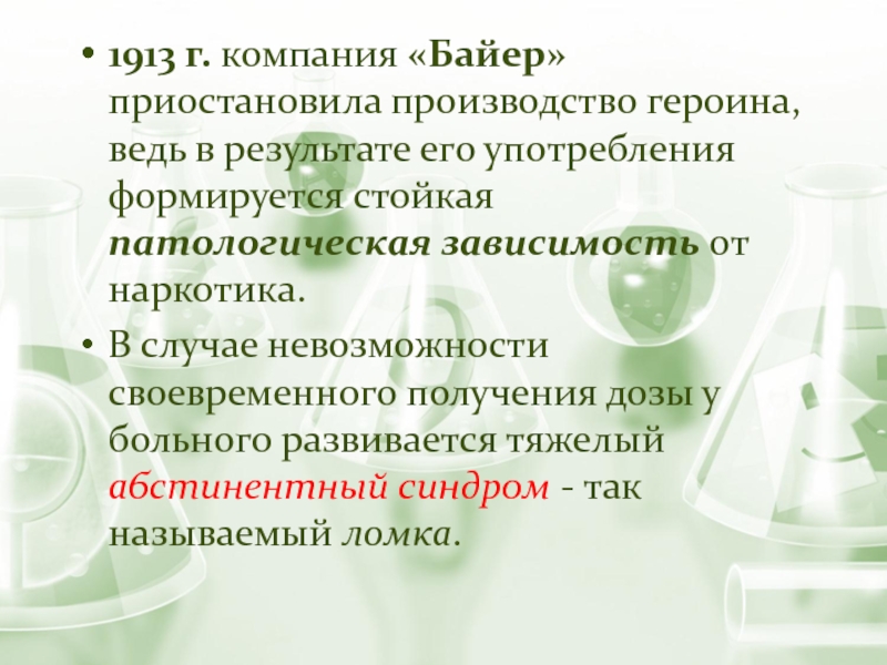 Слайд 521913 г. компания «Байер» приостановила производство героина, ведь в результате его