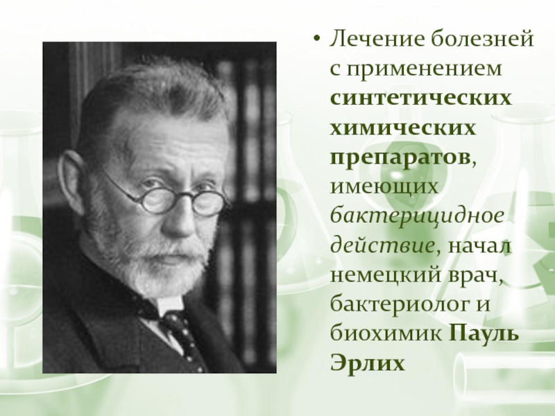 Слайд 49Лечение болезней с применением синтетических химических препаратов, имеющих бактерицидное действие, начал