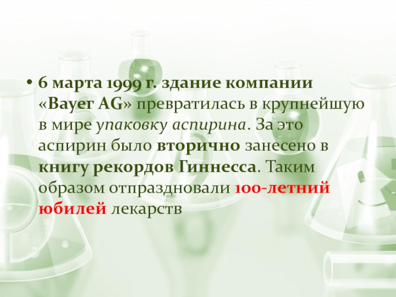 в мире упаковку аспирина. За это аспирин было вторично занесено в книгу рекордов Гиннесса. Таким образом отпраздновали 100-летний юбилей лекарств