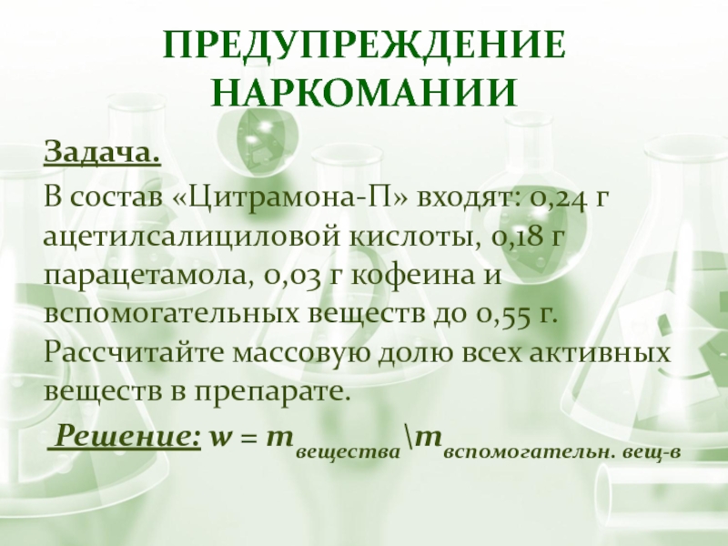 парацетамола, 0,03 г кофеина и вспомогательных веществ до 0,55 г. Рассчитайте массовую долю всех активных веществ в препарате.