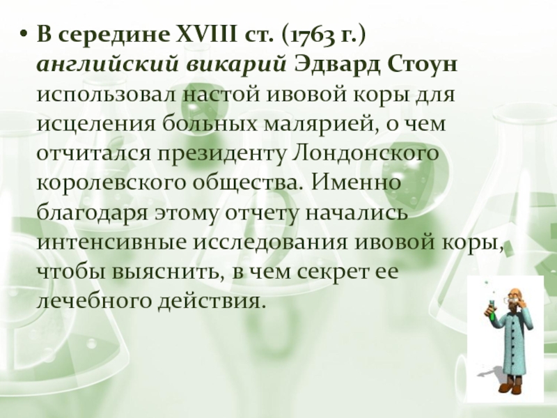 настой ивовой коры для исцеления больных малярией, о чем отчитался президенту Лондонского королевского общества. Именно благодаря этому отчету начались интенсивные исследования ивовой коры, чтобы выяснить, в чем секрет ее лечебного действия.
