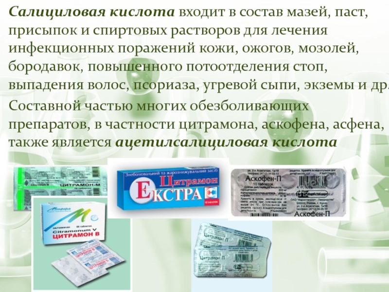 Составной частью многих обезболивающих препаратов, в частности цитрамона, аскофена, асфена, также является ацетилсалициловая кислота