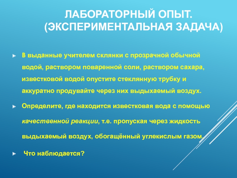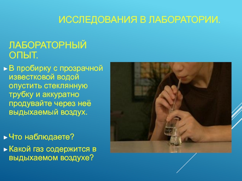 прозрачной обычной водой, раствором поваренной соли, раствором сахара, известковой водой опустите стеклянную трубку и аккуратно продувайте через них выдыхаемый воздух.