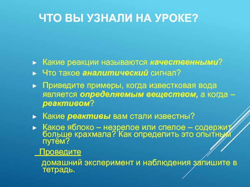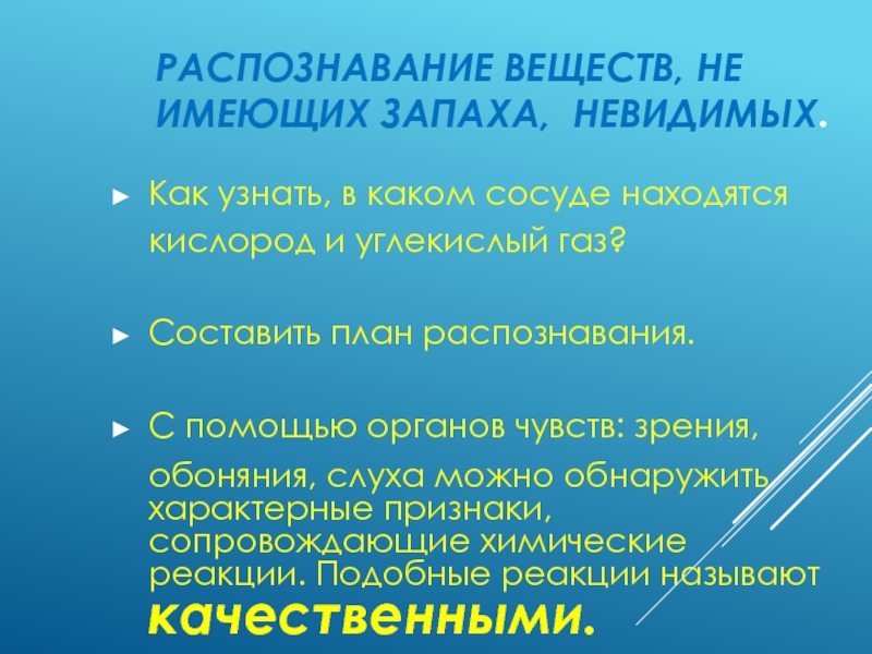 обоняния, слуха можно обнаружить характерные признаки, сопровождающие химические реакции. Подобные реакции называют качественными.