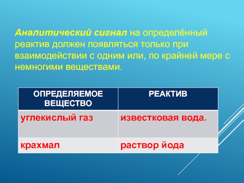Слайд 12Аналитический сигнал на определённый реактив должен появляться только при взаимодействии с