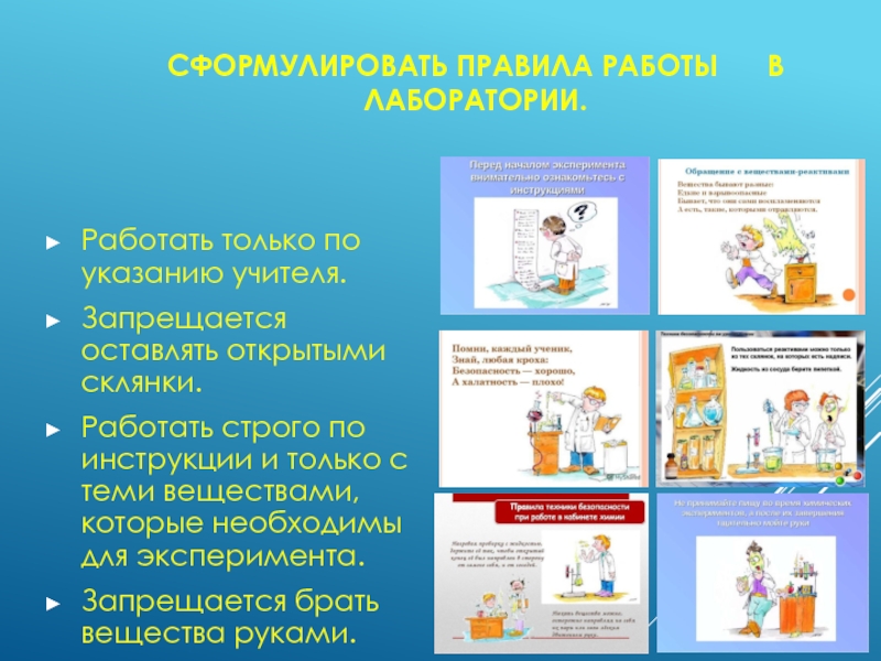Слайд 3СФОРМУЛИРОВАТЬ ПРАВИЛА РАБОТЫ В ЛАБОРАТОРИИ.