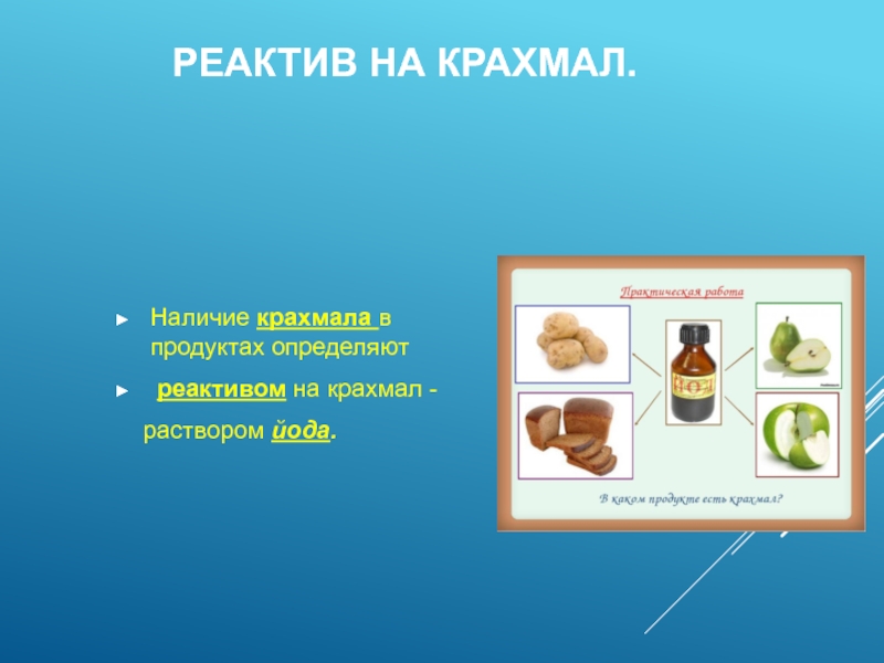 Слайд 14РЕАКТИВ НА КРАХМАЛ.