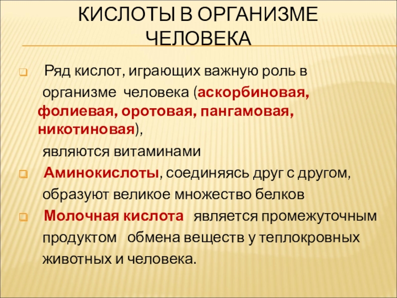 Слайд 29КИСЛОТЫ В ОРГАНИЗМЕ ЧЕЛОВЕКА