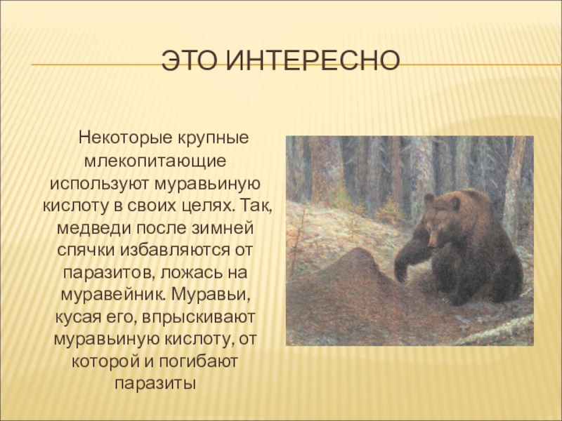 в своих целях. Так, медведи после зимней спячки избавляются от паразитов, ложась на муравейник. Муравьи, кусая его, впрыскивают муравьиную кислоту, от которой и погибают паразиты
