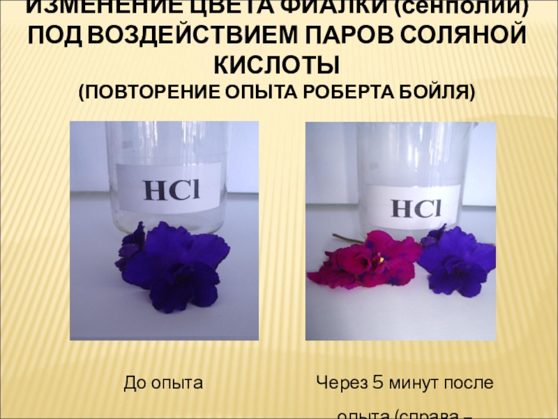 Слайд 12ИЗМЕНЕНИЕ ЦВЕТА ФИАЛКИ (сенполии) ПОД ВОЗДЕЙСТВИЕМ ПАРОВ СОЛЯНОЙ КИСЛОТЫ