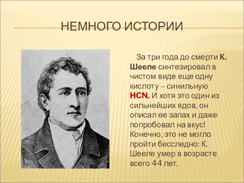 К.Шееле синтезировал в чистом виде еще одну кислоту – синильную HCN. И хотя это один из сильнейших ядов, он описал ее запах и даже попробовал на вкус! Конечно, это не могло пройти бесследно: К.Шееле умер в возрасте всего 44 лет.