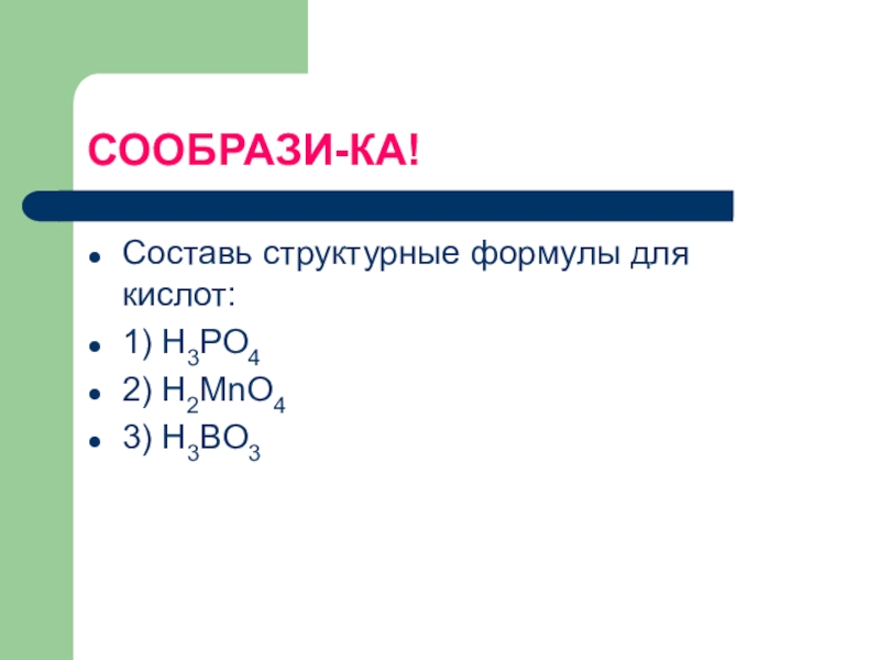СООБРАЗИ-КА!Составь структурные формулы для кислот:1) H3PO42) H2MnO43) H3BO3