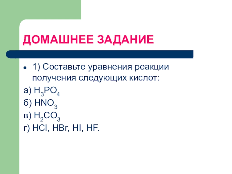 ДОМАШНЕЕ ЗАДАНИЕ1) Составьте уравнения реакции получения следующих кислот:а) H3PO4б) HNO3в) H2CO3г) НCl, HBr, HI, HF.