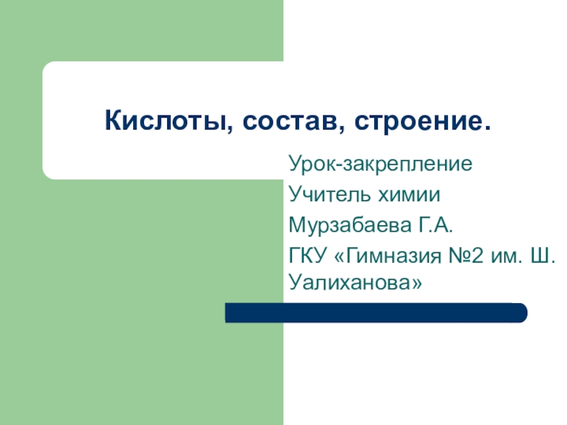 Урок-закреплениеУчитель химииМурзабаева Г.А.ГКУ «Гимназия №2 им. Ш.Уалиханова»Кислоты, состав, строение.