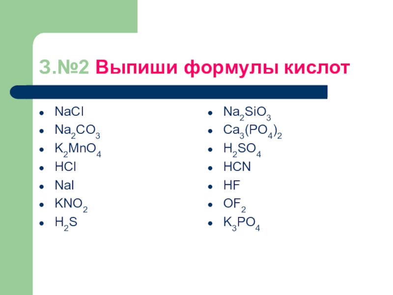 З.№2 Выпиши формулы кислотNaClNa2CO3K2MnO4HClNaIKNO2H2SNa2SiO3Ca3(PO4)2H2SO4HCNHFOF2K3PO4