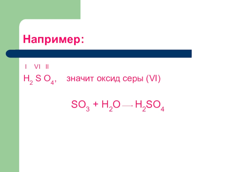 Например: I  VI IIH2 S O4,  значит оксид серы (VI)SO3 + H2O   H2SO4