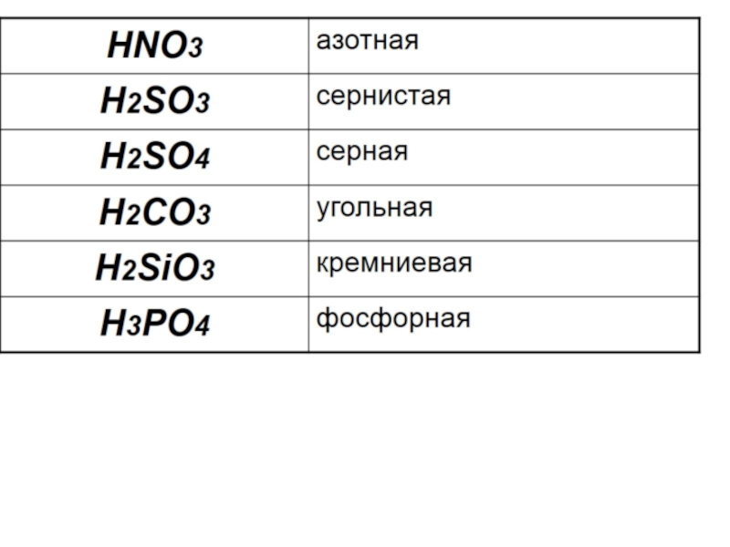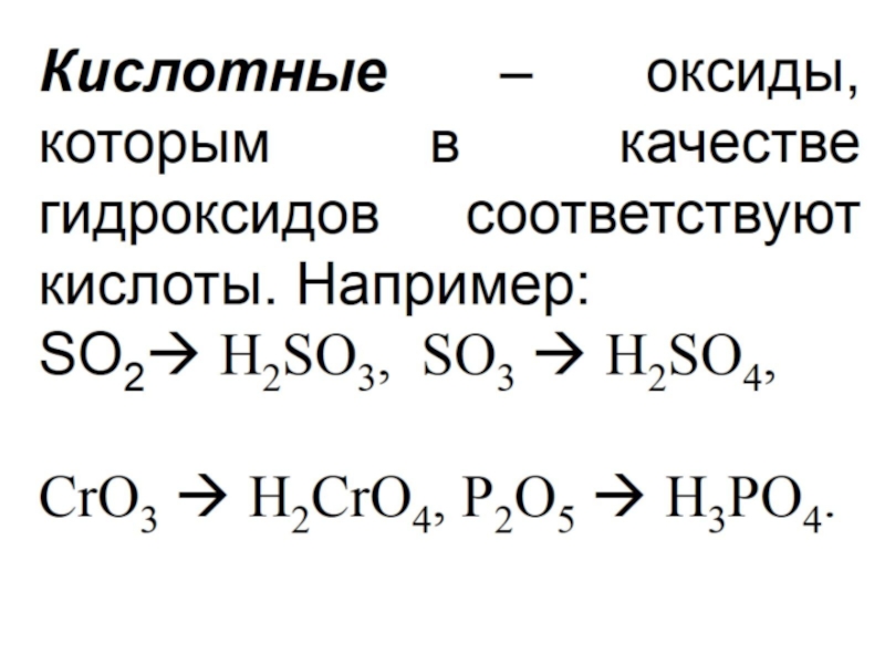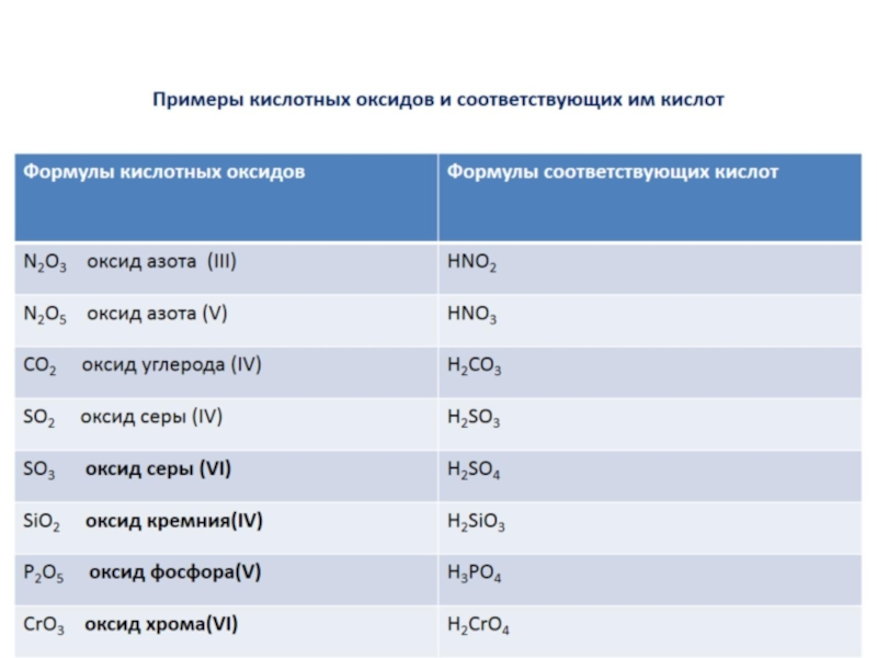 Слайд 8Примеры кислотных оксидов и соответствующих им кислот